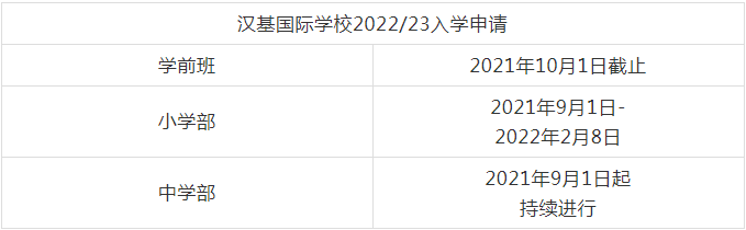 漢基的中學(xué)部最早可于入學(xué)前1年提出申請。申請期限從入學(xué)前一年的9月1日起開始并持續(xù)進行。