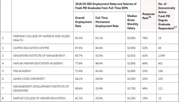 總體的情況是,有80.7%的私立院校畢業生在畢業6個月內找到工作(包括全職、兼職、短期、自由職業等),其中全職就業率為49%,全職月薪中位數為2900新幣。