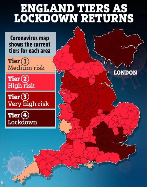 英國防疫等級示意圖,顏色最深區域為四級封鎖區域