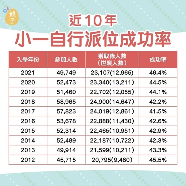 香港教育局統計2021-22年小一入學自行分配學位共有49,749個申請,一輪派位成功有23,107人,成功率不足50%,剩下26,642位申請人首輪派位不成功,預計有超過25,000人參加統一派位,派位結果將在今年6月2及3日公布。