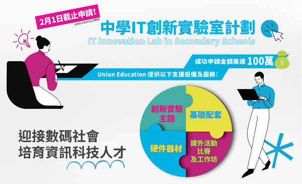 為了讓中學(xué)生有更多資源及機(jī)會,財(cái)政司在2019至20年度財(cái)政預(yù)算案撥出5億元推行「中學(xué)IT創(chuàng)新實(shí)驗(yàn)室計(jì)劃」,每間中學(xué)可申請最高100萬元的資助。去年12月推出至今已有超過40間學(xué)校申請。